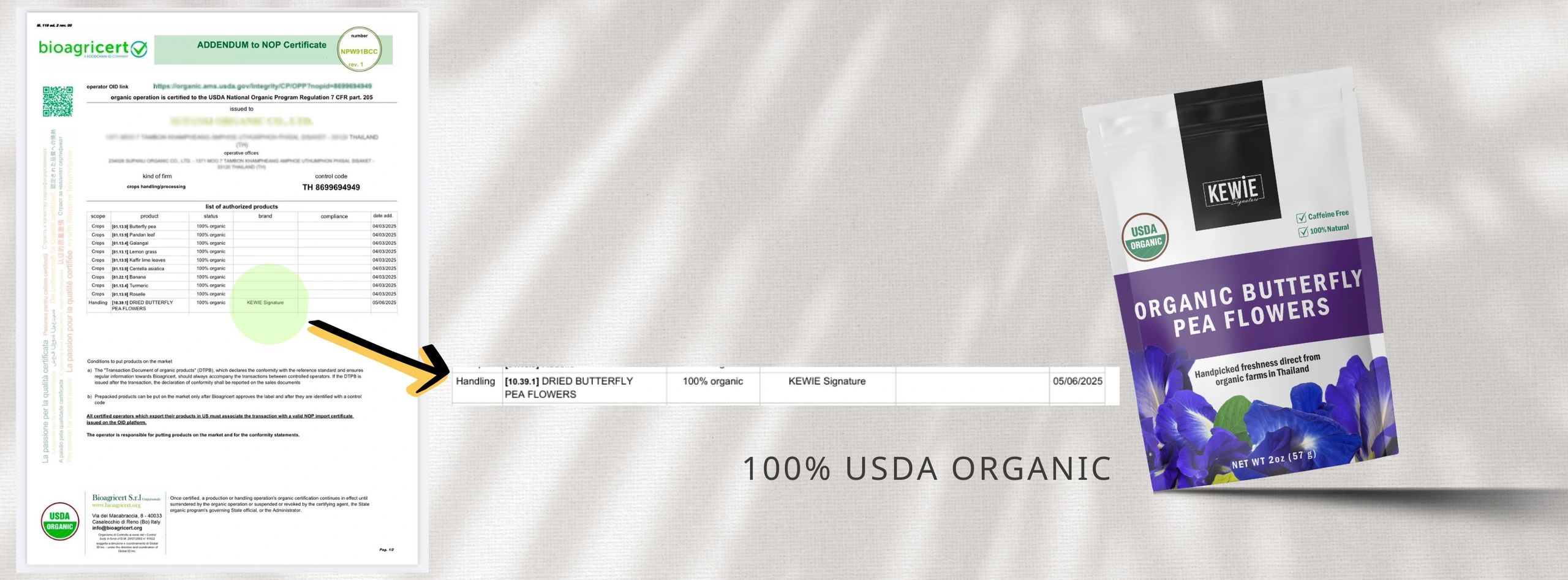 With its vivid color and revitalizing flavor, KEWIE Signature Organic Butterfly Pea Flower Tea is a caffeine-free herbal tea that will revolutionize your tea routine. Handpicked from organic farms in Thailand and carefully dried to preserve their natural nutrients, these premium-grade flowers are rich in antioxidants and offer a smooth, clean flavor in every sip. Our butterfly pea tea is 100% vegan, USDA certified organic, and gluten-free, giving you a natural and healthy experience.